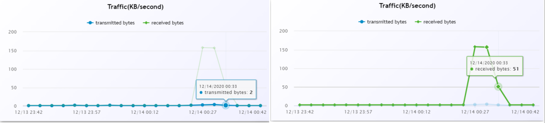 Traffic: To measure bandwidth, the total amount of traffic sent and received across a specific period of time is counted. The blue line shows the transmitted bytes (KB/second) at the displayed timestamp; while the green one shows the received bytes (KB/second).